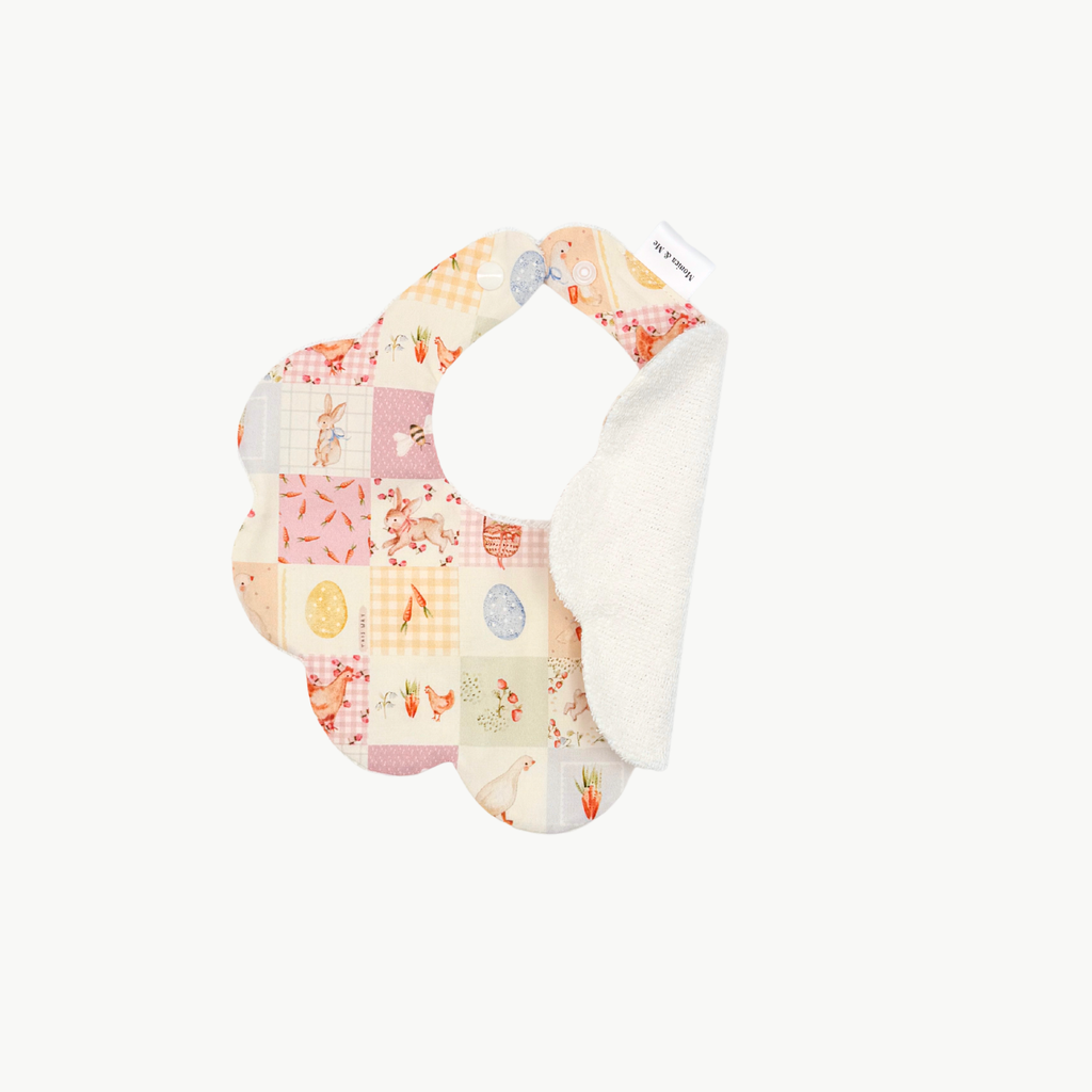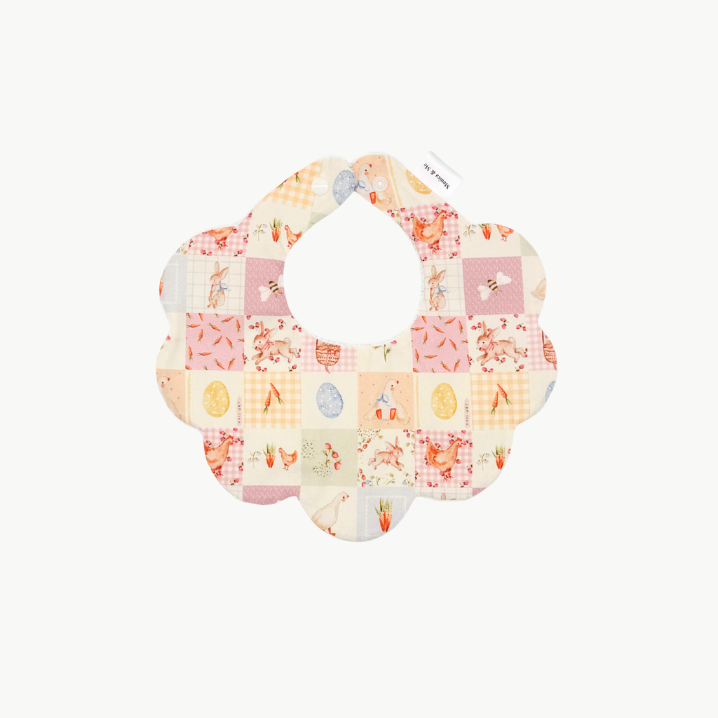 Garden Quilt brings together charming squares of storybook scenes — bunnies among flowers, ducks by the pond, carrots fresh from the garden and soft gingham details. The quilt-inspired design feels nostalgic and joyful, like a tiny garden stitched into fabric.