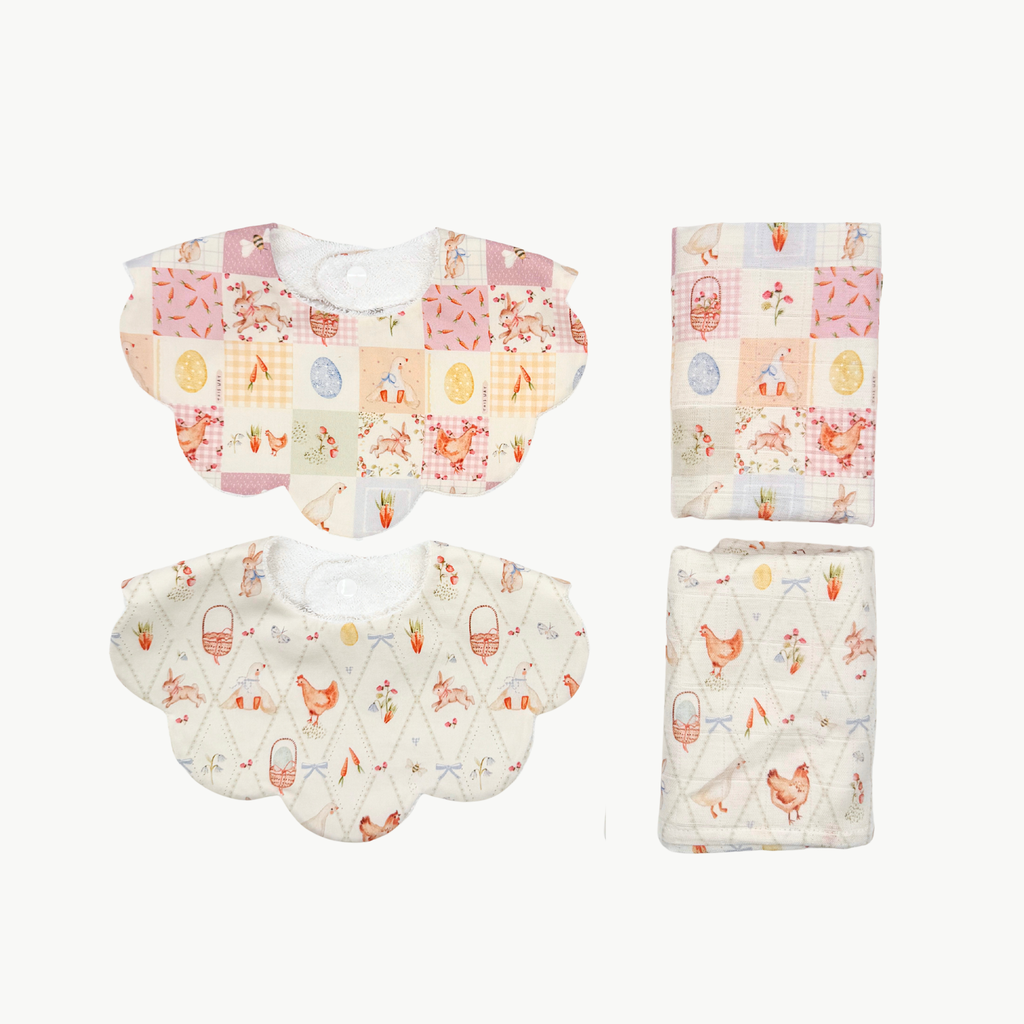 Inside the set you’ll find two of our signature scalloped baby bibs, paired with two soft 100% premium cotton muslin squares printed in the UK. The bibs are crafted from premium cotton and backed with absorbent terry towelling to help keep little outfits dry, while the lightweight muslin squares are perfect for feeding, burping and everyday baby moments.