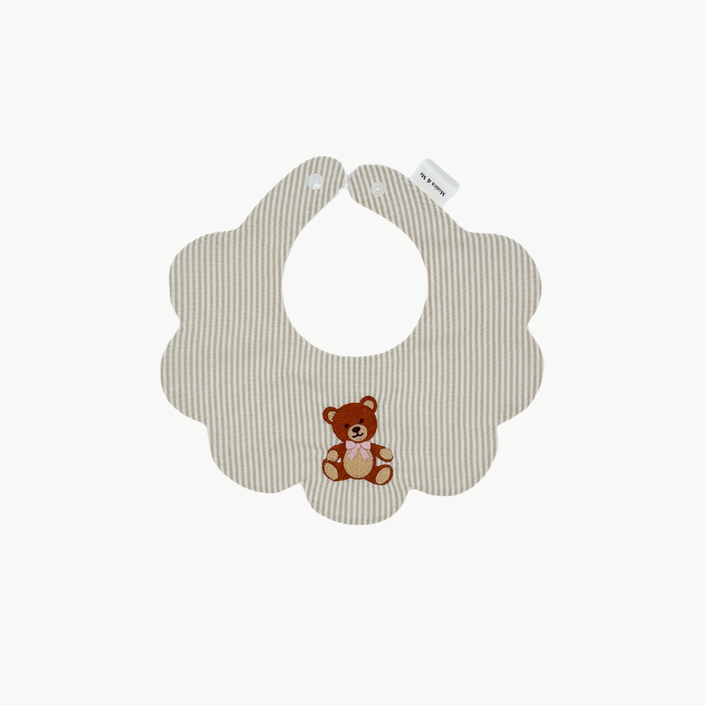 1x Sand Striped bib with an embroidered Teddy Bear